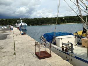 Il molo è occupato da barche da pesca locali e da un traghetto.