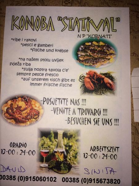 Ausgezeichnetes, uriges Lokal. Offen Juli, August. Einfach anrufen und lange läuten lassen, noch besser ein SMS. Nur selbstgefangener Fisch. Kornateneintrittsschein notwendig.