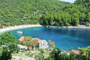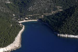 Beautiful bay which is exposed to the south and southwest. There is a swell on Jugo. The ground is sand and seaweed, poor holding. Nice pebble beach in the base of the bay. In the summer are two restaurants open.